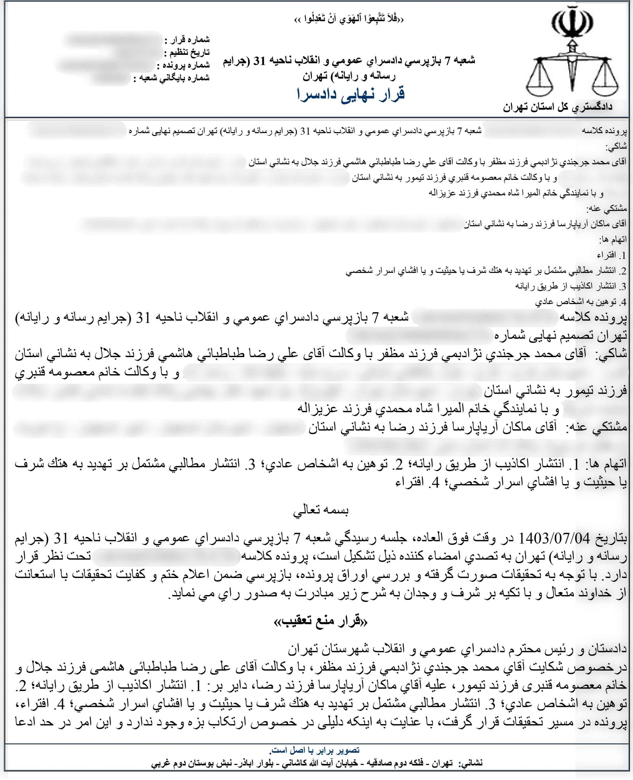 آقای محمد جرجندی بابت دفاعیاتی که در اینجا مطرح شد، به جرم نشر اکاذیب و افترا از طریق وکیل خود علیه دکتر آریا پارسا شکایتی را ثبت نمود. دادگاه در تاریخ 4 مهر 1403 این شکایت را بررسی کرد ولی به دلیل این که هیچ مدرک و دلیلی وجود نداشت و شکایت فقط در حد ادعا بود، قرار منع تعقیب را صادر کرد. حکم رای صادره در ادامه آورده شده است: