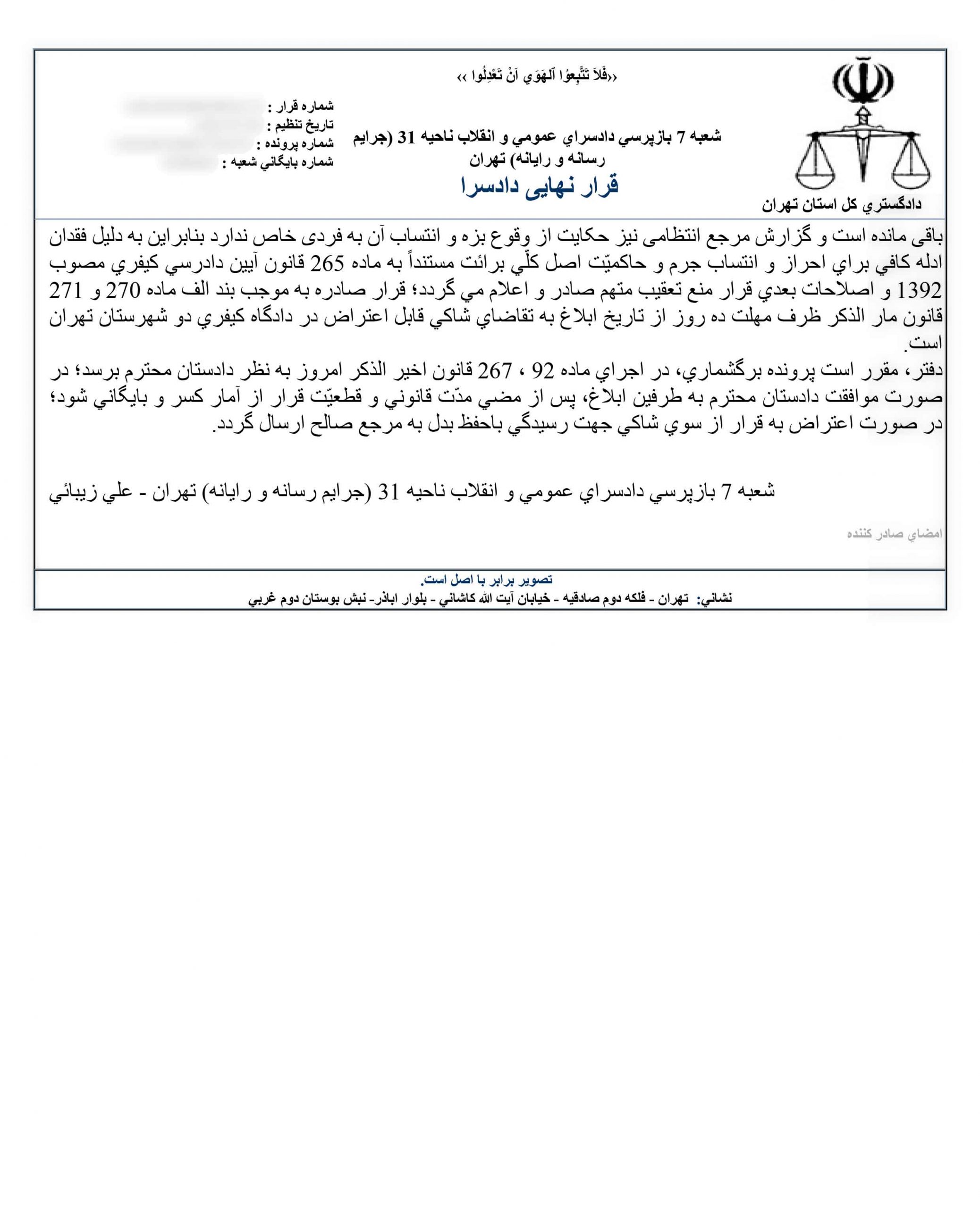 صدور رای قطعی دادسرا بابت شکایت محمد جرجندی
