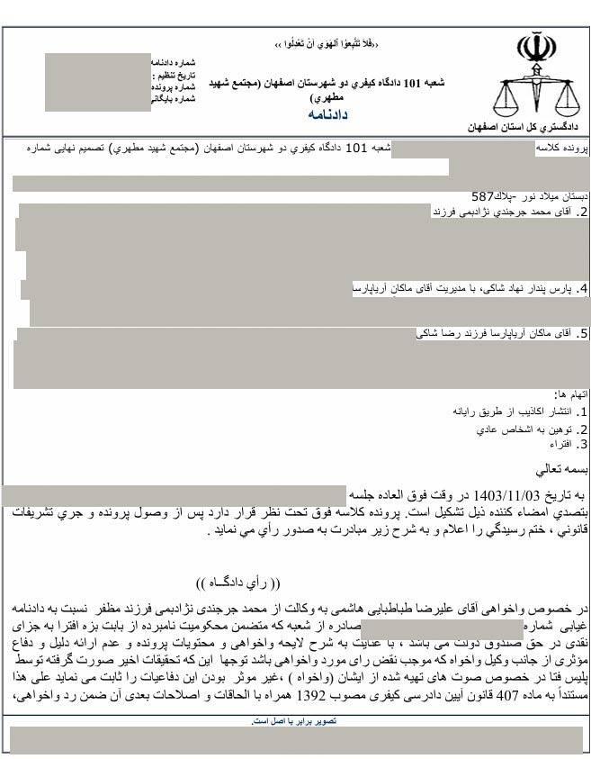 با توجه به درخواست تجدیدنظر آقای محمد جرجندی نسبت به حکم 2 سال حبس وی، جلسه ای در تاریخ 14 اسفند ماه 1403 در دادگاه تجدید نظر استان اصفهان تشکیل شد و با توجه به اینکه وی هیچ ادله قطعی راجع به افتراهای خود نسبت به دکتر آریا پارسا و گروه بین المللی پارس پندار نهاد ارائه نکرد، دادگاه تجدیدنظر، حکم قطعی 2 سال حبس را برای ایشان صادر نمود. همچنین در این دادگاه به اتهامات یکی از ادمین های آقای جرجندی که وی نیز افتراهایی را نسبت به دکتر آریا پارسا در شبکه های اجتماعی مطرح کرده بود، رسیدگی شد. ایشان در دادگاه بدوی به یک سال حبس تعزیری محکوم شده بود ولی با توجه به عذرخواهی وی و رضایت دکتر آریا پارسا، حکم برائت برای ایشان صادر گردید. تصویر حکم صادر شده به شرح زیر است: