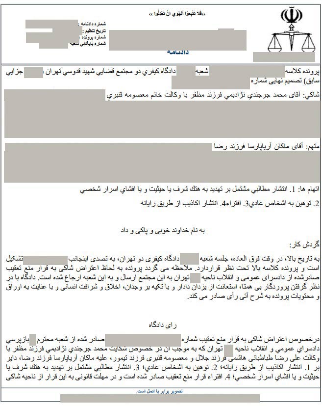 1- به کلیه این ادعاها در شعب 751، 209 بازپرسی مشهد و 29 بازپرسی و 7 دادیاری و 5 دادیاری اصفهان رسیدگی شده و آقای ماکان آریا پارسا تماماً تبرئه قطعی شده است.