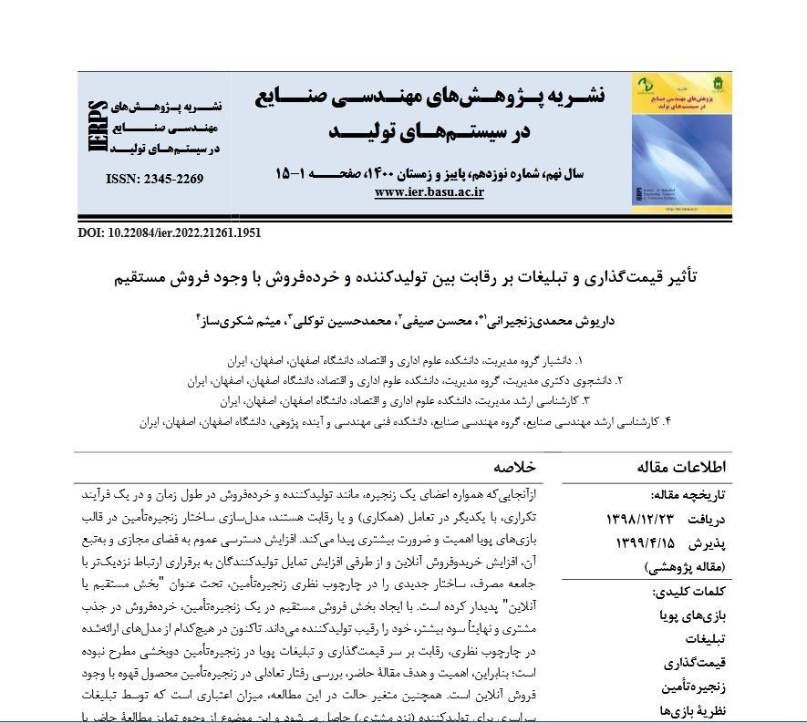 | 1 | تاثیر قیمتگذاری و تبلیغات بر رقابت بین تولیدکننده و خردهفروش با وجود فروش مستقیم، پژوهشهاي مهندسي صنايع در سيستمهاي توليد- دانشگاه ابوعلي سينا، زمستان 1400 |
