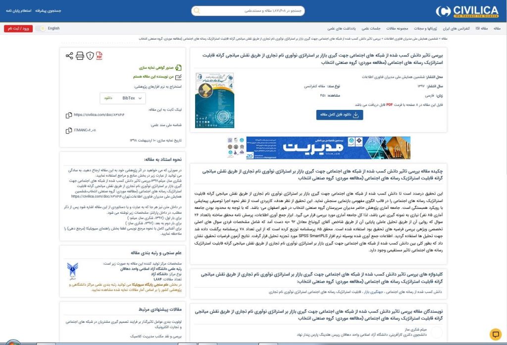 | 10 | بررسی تاثیر دانش کسب شده از شبکههای اجتماعی جهتگیری بازار بر استراتژی نوآوری نام تجاری از طریق نقش میانجیگرانه قابلیت استراتژیک رسانههای اجتماعی، ششمین همایش ملی مدیران فناوری اطلاعات، تابستان 1397 |